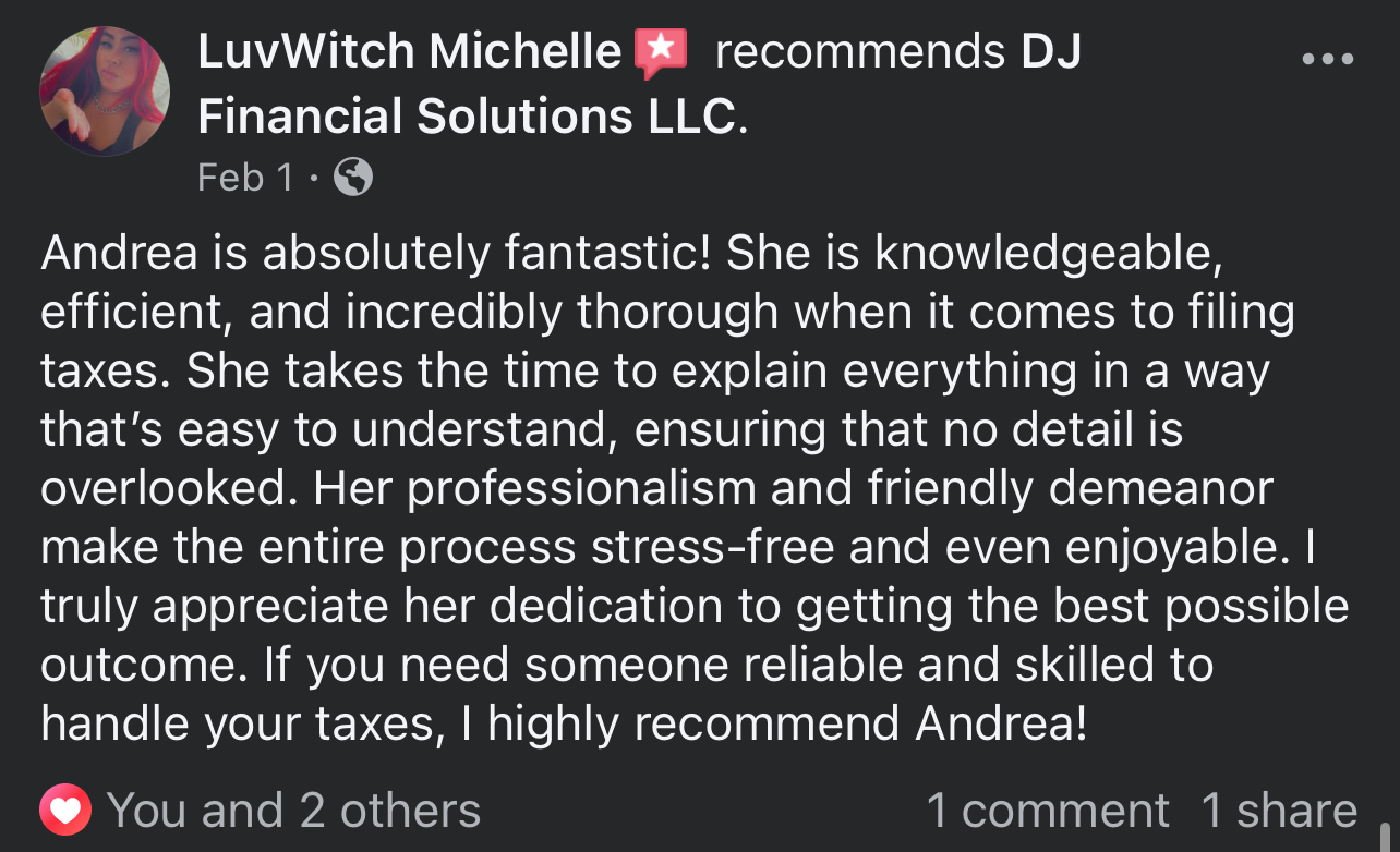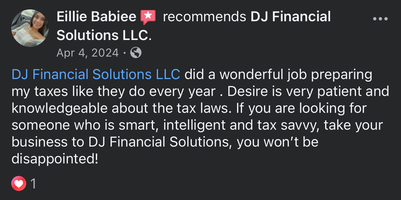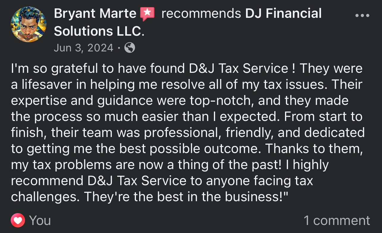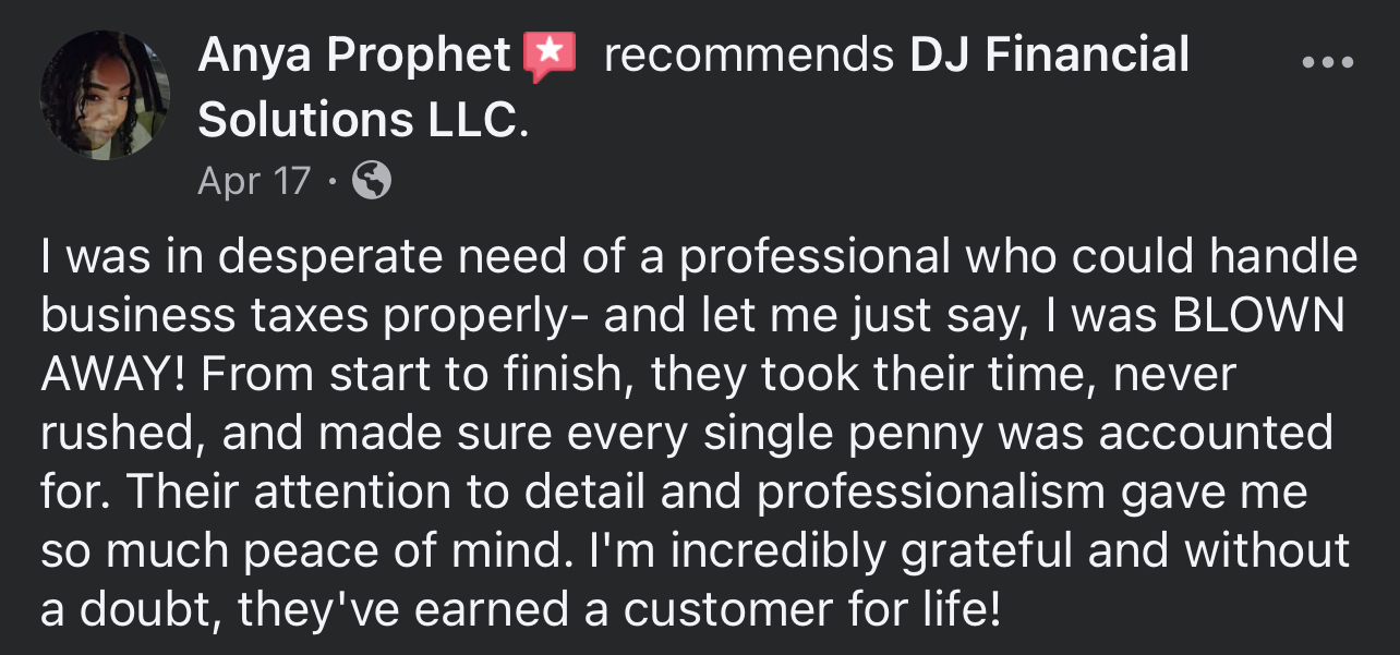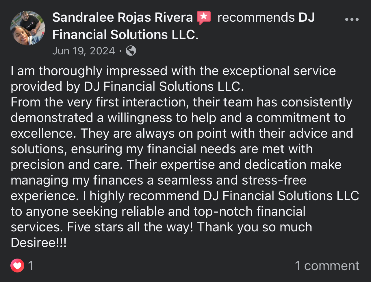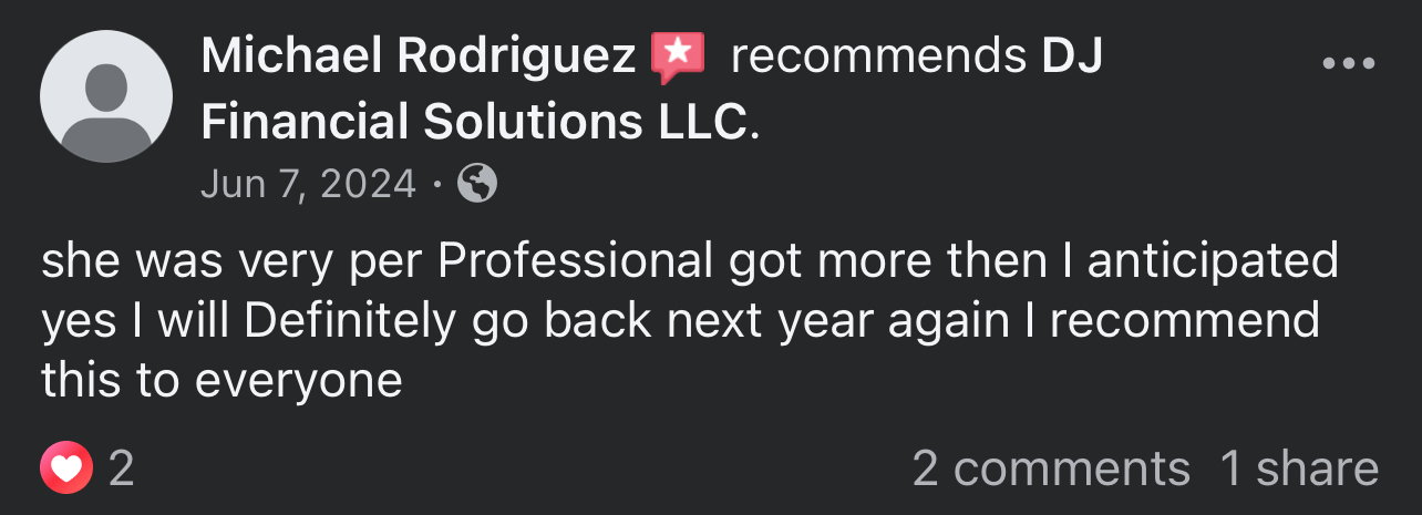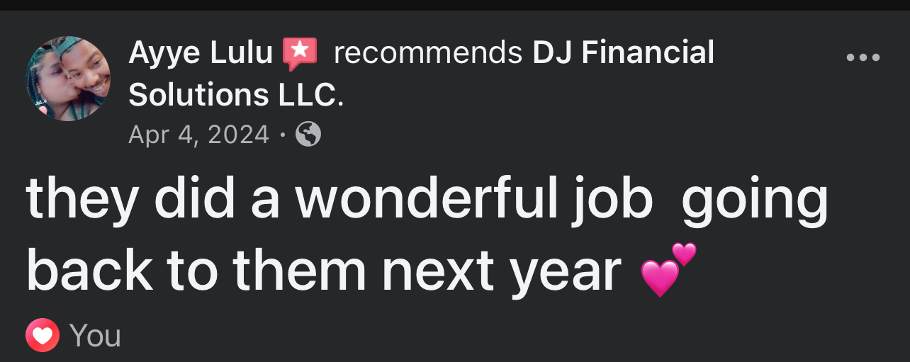 At D&J Financial Solutions, we value your feedback! Our review section is dedicated to showcasing experiences from our clients, helping others make informed decisions about our services. Whether it’s a positive testimonial or constructive feedback, your voice helps us grow and improve. Read what others are saying, and if you’ve worked with us, we’d love to hear from you too!
